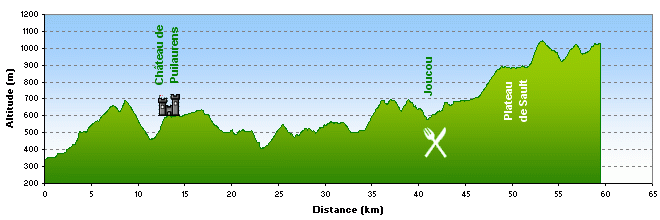 Il faut quand même remonter sur le plateau de Sault. C’est roulant sur le plateau, sauf à la sortie d’Espezel, où une dernière côte bien pentue nous permet de rejoindre Belcaire.